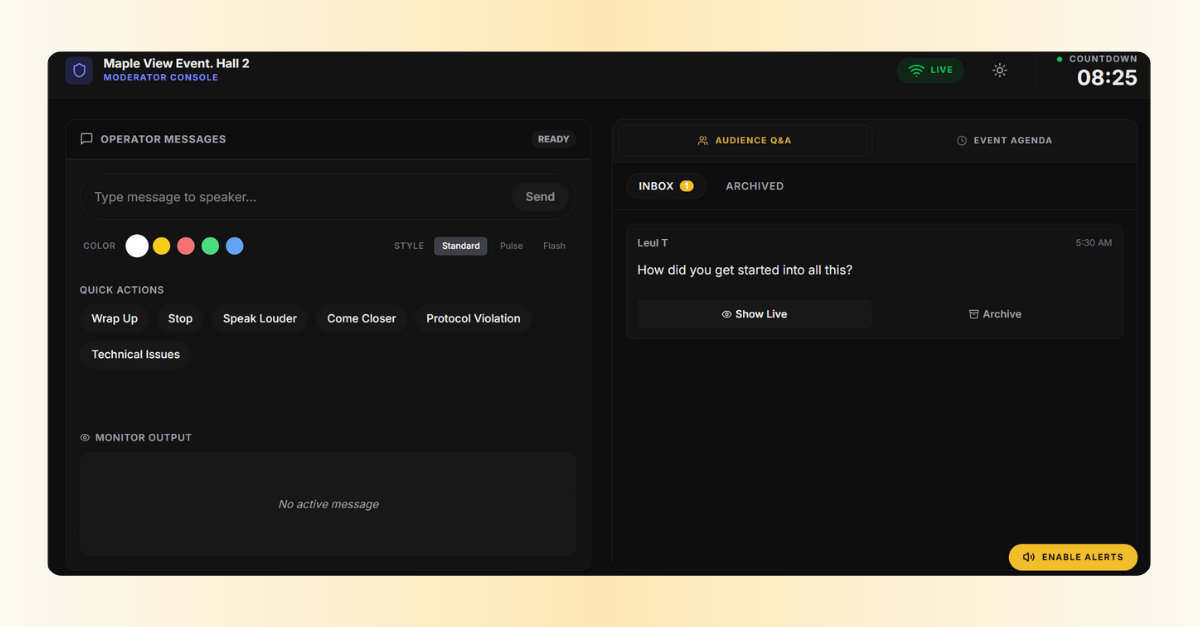 Switch between the Message Console and Audience Q&A in a single view. Give your producers total control over stage interaction.